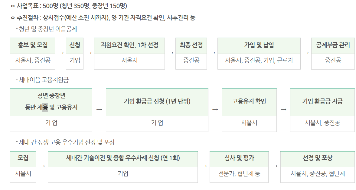 서울형 이음공제는 전국 최초 세대 간 상생고용을 통한 일자리 창출 해법으로 서울시 소재 중소 중견기업 사장님들이 서울시민 청년과 중장년청을 고용할 경우 서울시에서 지원해주는 제도입니다.