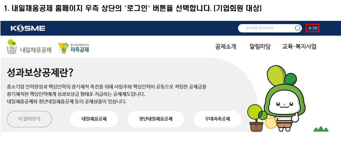 1. 기업이 신청서와 동의서, 증빙서류 준비 => 2. 온라인(중진공 내일채움공제 홈페이지) 또는 우편 신청